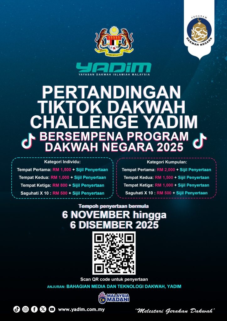 PERTANDINGAN TIKTOK DAKWAH CHALLENGE YADIM bersempena Program Dakwah Negara 2025! Tema: “Membangun Adab, Membina Negara” Khusus untuk belia berusia 13-30 tahun Cipta video dakwah paling kreatif dan inspiratif berdurasi 1 – 2 minit dalam Bahasa Melayu, Inggeris atau Arab (sertakan sari kata BM jika selain BM) Kategori & Hadiah Menarik! Individu: RM1,500 + Sijil Penyertaan […]
